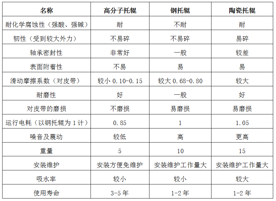 3、重量輕---只有鋼托輥的三分之一,陶瓷托輥的五分之一,便于施工安裝,同時(shí)具有良好的節(jié)電效果。