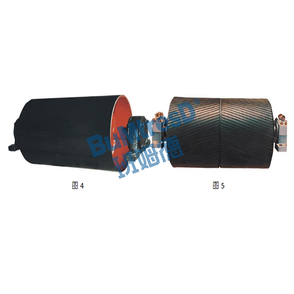 人字形溝槽鑄(包)膠滾筒(如圖5)是在鋼制光面滾筒表面,加一層帶人字溝槽的橡膠層,這樣可以大大增加皮帶和滾筒之間的摩擦系數(shù)。在潮濕環(huán)境中,溝槽能使水的薄膜中斷,不積水,同時(shí)輸送帶與滾筒接觸時(shí),輸送帶表面能擠壓到溝槽里,由于這兩各原因,即使在潮濕的場(chǎng)合工作,摩擦系數(shù)降低也很小。但這種滾筒運(yùn)行方向?yàn)槿俗中畏较?,不得反向運(yùn)轉(zhuǎn)。