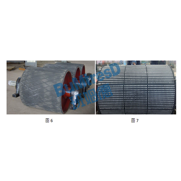 人字形溝槽鑄(包)膠滾筒(如圖5)是在鋼制光面滾筒表面,加一層帶人字溝槽的橡膠層,這樣可以大大增加皮帶和滾筒之間的摩擦系數(shù)。在潮濕環(huán)境中,溝槽能使水的薄膜中斷,不積水,同時(shí)輸送帶與滾筒接觸時(shí),輸送帶表面能擠壓到溝槽里,由于這兩各原因,即使在潮濕的場(chǎng)合工作,摩擦系數(shù)降低也很小。但這種滾筒運(yùn)行方向?yàn)槿俗中畏较?,不得反向運(yùn)轉(zhuǎn)。